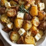 4. Bake: Place the dish in the oven and bake for 35–40 minutes until the potatoes are golden brown with crispy edges and the feta cheese is soft and lightly browned on top.