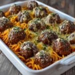 This comforting baked spaghetti and meatballs casserole features tender homemade meatballs simmered in marinara sauce, layered with al dente spaghetti, and topped with gooey mozzarella and Parmesan cheese, then baked to golden perfection. A classic Italian-American dish perfect for family dinners or entertaining guests.