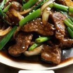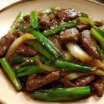 This Beef and Onion Stir Fry is a quick and flavorful dish featuring tender slices of marinated flank steak cooked with aromatic garlic, ginger, and onions in a savory soy-based sauce. Perfect for a satisfying weeknight dinner, this stir fry combines the richness of hoisin and oyster sauce with the subtle sweetness of brown sugar and the depth of Shaoxing wine for a balanced and delicious meal.