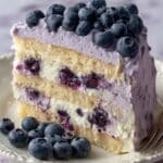 Once decorated, keep any leftover Blueberry Cream Cake in the refrigerator covered with plastic wrap or in an airtight cake container. It will stay fresh and moist for up to 3 days, making it easy to enjoy a slice or two over a few afternoons.