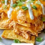 Once out of the oven, sprinkle sliced green onions over the top for a fresh, vibrant finish. Serve your Buffalo Chicken Nachos Recipe immediately while warm and melty, ready to enjoy every crunchy, spicy, cheesy bite.