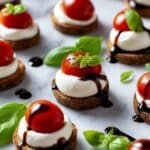 - Season and Finish: Drizzle the assembled bites with extra virgin olive oil and season with salt and freshly ground black pepper to taste. Just before serving, drizzle the cooled balsamic reduction evenly over the bites to add a sweet and tangy finish.
