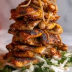 This Chicken Shawarma Tower is a flavorful Middle Eastern-inspired dish featuring marinated boneless chicken thighs stacked vertically to create a tower and baked in the oven until juicy and crispy. Infused with spices like cumin, coriander, paprika, turmeric, and allspice, the shawarma is tender and aromatic. Layered with thinly sliced onions and drizzled with olive oil, it makes for an impressive and delicious main course served with pita bread, rice, or salad.