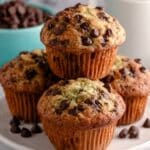 Delicious and moist Chocolate Chip Zucchini Muffins made with cocoa powder, shredded zucchini, and semi-sweet chocolate chips. These muffins are perfect for a nutritious snack or breakfast treat, combining the subtle sweetness of zucchini with rich chocolate flavor.