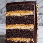10. Assemble Cake Layers: On a cake board or serving plate, spread a layer of frosting over the first cake layer, followed by a generous layer of peanut caramel. Repeat layering with the remaining cakes. Chill if needed to make stacking easier and neater.