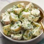 This potato salad is best served cold or at room temperature. Reheating is not necessary as the freshness in flavor and texture is what makes this Classic Red Potato Salad Recipe shine. Simply give it a stir after removing from the fridge to refresh the flavors.