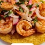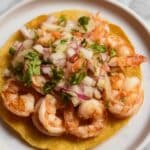 This recipe is best made fresh and doesn’t freeze well due to the texture changes in the shrimp and vegetables. For the freshest taste and ideal texture, avoid freezing the ceviche or assembled tostadas.
