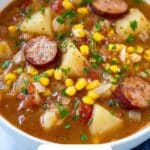 Now it’s time to bring everything together! Add the diced tomatoes, baked or ranch beans, chopped green chilies, sweet corn, cubed potatoes, crispy bacon, browned kielbasa, and one cup of water into the pot. Turn up the heat until it reaches a boil, then reduce to low and cover. Let it simmer gently for one hour, stirring occasionally so the flavors can meld beautifully and the potatoes become tender.