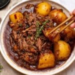 The recipe calls for chuck roast because of its marbling and tenderness after slow cooking, but brisket or round roast can also work if you prefer, keeping in mind cooking times may vary.