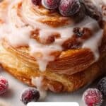 - Glaze and Garnish: Drizzle the vanilla butter glaze over the slightly cooled danishes. Top each danish with a few of the sugared cranberries for a decorative and flavorful finishing touch. Serve and enjoy!