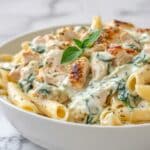 Return the cooked pasta to the skillet with the creamy sauce, tossing to coat each piece lavishly. If your sauce feels too thick, gradually add the reserved pasta water a little at a time to reach that perfect, creamy consistency that clings beautifully to your noodles. Now, add the sliced chicken and toss again to distribute it evenly throughout the dish, making sure every forkful gets a bit of that tender, seasoned chicken goodness.
