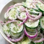 A refreshing and creamy cucumber salad featuring thinly sliced cucumbers and red onions tossed in a tangy sour cream dressing with fresh dill, perfect for a quick and easy side dish in just 15 minutes.