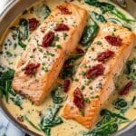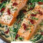 This Creamy Garlic Butter Tuscan Salmon is a rich and flavorful dish featuring tender salmon fillets cooked in a luscious garlic butter sauce with sun-dried tomatoes, spinach, and Parmesan cheese, perfect for an elegant yet easy-to-make dinner.