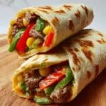These Crispy Steak Wraps are a savory and satisfying meal perfect for lunch or dinner. Featuring tender skirt or flank steak seasoned with a zesty spice blend, sautéed bell peppers and onions, melted Mexican cheese, and creamy guacamole and sour cream, all wrapped in a warm flour tortilla with a crispy tostada layer inside for added crunch. Pan-seared to golden perfection, these wraps offer a delightful combination of textures and bold flavors.