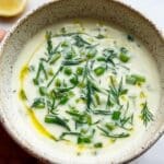 This dish pairs wonderfully with light Mediterranean-inspired sides, such as crusty bread, marinated olives, or a crisp salad. The creamy, chilled soup contrasts nicely with crunchy textures and can act as a refreshing palette cleanser between heartier bites.