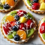 - Decorate with Fruit and Garnish: Arrange the assorted fresh fruits—strawberries, blueberries, kiwi slices, and mandarin orange segments—on top of each frosted cookie in a decorative pattern. Optionally, sprinkle shredded coconut over the fruit for an added tropical touch and texture.