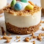 Feel free to get creative with garnishes to make your mini cheesecakes visually stunning. A dusting of powdered sugar, a drizzle of melted chocolate, or a sprig of fresh mint can elevate the presentation. The Easter-themed candies add a cheerful pop of color that perfectly matches the holiday spirit.