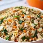 - Combine ingredients: In a large mixing bowl, combine the shredded chicken, cooked rice, and the cooked vegetables.