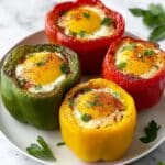 Delicious and colorful egg-stuffed bell peppers baked to perfection, combining fluffy eggs with melted cheese and fresh vegetables for a savory breakfast or brunch option.
