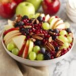 1. Prepare the Fruit: Core and chop the apples and pears into bite-sized pieces. Halve the grapes, and gather the pomegranate arils and dried cranberries.