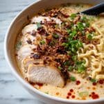 Finish with a generous sprinkle of chopped green onions on top. Their fresh, mild crunch adds contrast to the creamy, spicy warmth of the dish. Serve immediately, piping hot, and enjoy every bite of this soul-satisfying bowl of Fiery Chicken Ramen with Creamy Garlic Sauce Recipe!