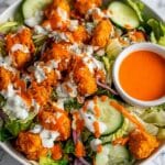 - Finish and Serve: Top the salad with the buffalo chicken strips and drizzle with additional ranch or blue cheese dressing as desired. Serve immediately to enjoy the crispy texture and fresh flavors.