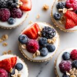 Now for the fun part! Spoon a creamy layer of Greek yogurt into each granola base, filling the cups almost to the top. Then, crown each cup with fresh berries of your choice—whether it’s blueberries, strawberries, raspberries, or a combination. Feel free to sprinkle any leftover granola dough over the top for an extra crunch and a pretty finishing touch.