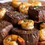 - Combine and Serve: Return the steak bites and shrimp to the skillet, tossing them in the garlic butter sauce. Add lemon juice for extra flavor, if desired. Garnish with freshly chopped parsley.