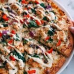 This Greek Pizza with Tzatziki Drizzle combines classic Mediterranean flavors with a cheesy, savory pizza twist. Featuring a crispy pizza crust topped with shredded chicken, cooked spinach, red onion, black olives, red bell pepper, mozzarella, and feta cheese, it’s finished with a refreshing Hidden Valley Greek Tzatziki sauce drizzle that adds a cool, tangy contrast. Perfect for a quick and flavorful meal ready in just 40 minutes.
