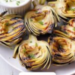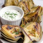 If you don’t have outdoor grilling access, you can use a grill pan on the stove or roast the artichokes in the oven at 400°F until tender and slightly charred. Results will be deliciously close!
