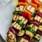 While not ideal to freeze after grilling because halloumi’s texture can change, you can freeze the marinated halloumi cubes before grilling for up to 2 months. Just thaw thoroughly in the fridge before threading onto skewers and grilling fresh.