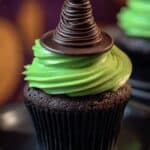 These Halloween Witch Hat Cupcakes combine rich dark chocolate cupcakes filled with a creamy, vibrant green cream cheese filling and topped with whimsical chocolate witch hats. Perfect for festive parties, this recipe uses a boxed cake mix for convenience and adds a fun decorative twist with chocolate kisses and sandwich cookies to create an enchanting dessert that’s both easy and impressive.
