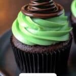 6. Decorate the Cupcakes: Once the cupcakes are completely cool, frost their tops generously with the dark chocolate frosting. Place a completed witch hat on top of each frosted cupcake to finish the decoration.