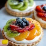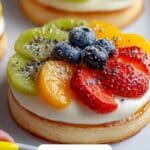 This healthy and colorful breakfast recipe features whole grain bagel halves topped with a creamy Greek yogurt spread and a vibrant assortment of fresh fruits. Sweetened lightly with honey or maple syrup and flavored with vanilla, these bagel fruit pizzas offer a delicious, fun, and nutritious start to the day, perfect for kids and adults alike.