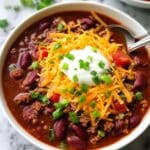 This hearty Beef Chili recipe combines ground beef, beans, and a rich tomato base with aromatic spices for a comforting and flavorful meal. Perfect for a cozy dinner, it simmers on the stovetop for about 55 minutes, developing deep, robust flavors. Topped with cheese, sour cream, or green onions, it’s a classic chili dish that’s both satisfying and easy to make.