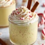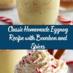 This Homemade Eggnog Recipe is a classic, creamy holiday beverage made with rich egg yolks, warm spices, milk, cream, and a splash of bourbon. Perfectly tempered and cooked to ensure safety, then chilled and topped with fluffy whipped egg whites for a smooth, festive treat. Garnished with crushed candy canes, melted chocolate, and cinnamon sticks for an extra holiday flair.