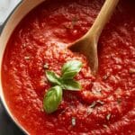 - Season and blend: Stir in fresh basil, salt, pepper, and optional sugar. Taste and adjust seasoning as needed. For a smoother sauce, use an immersion blender or pulse gently in a blender.