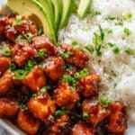 This Hot Honey Chicken Bowl recipe features tender, juicy chicken pieces coated in a spicy and sweet hot honey sauce, paired with roasted zucchini and summer squash, shredded carrots, creamy avocado, and a base of fluffy rice or quinoa. Perfectly balanced with a hint of heat and the freshness of lime and cilantro, this bowl is a flavorful, wholesome meal ready in under an hour.