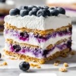 This refreshing Lemon Blueberry Icebox Cake is a delightful no-bake dessert featuring layers of gluten-free vegan graham crackers, fresh blueberries cooked into a luscious compote, and creamy vegan lemon whipped cream. Perfect for warm days, this cake sets in the refrigerator to develop its full flavors and offers a tangy, sweet, and fruity treat that serves 12.