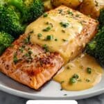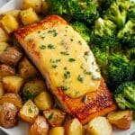 Plate your perfectly cooked lemon butter salmon alongside the crispy potatoes and roasted broccoli while everything’s piping hot. This beautiful, balanced plate is a guaranteed crowd-pleaser, a combination of textures and zesty, buttery flavors you’ll want to make again and again.