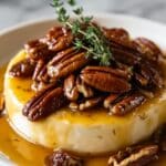 - Assemble the Dish: Pour the warm maple-pecan mixture over the baked brie, allowing it to soak into the soft cheese.
