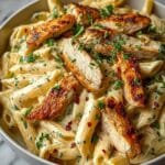 Slice the rested chicken into bite-sized pieces, then return it to the skillet with the creamy sauce. Add the cooked pasta and freshly chopped basil, tossing everything together gently. Heat through on low, ensuring every piece is coated in the dreamy sauce and infused with basil’s fresh flavor.