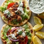 This Mediterranean Chicken Gyros recipe features tender, marinated grilled chicken thighs paired with a creamy feta tzatziki sauce, fresh vegetables, and warm pita bread. Perfect for a flavorful and wholesome meal, these gyros bring together classic Greek-inspired flavors with a satisfying blend of herbs, spices, and creamy textures.