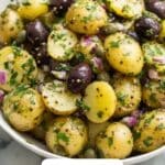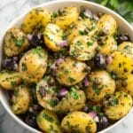 A vibrant Mediterranean Potato Salad featuring tender new potatoes tossed in a zesty dressing of olive oil, red wine vinegar, sumac, and lemon juice, complemented by kalamata olives, capers, red onion, and fresh parsley. This salad offers a flavorful, refreshing side dish perfect for any occasion.