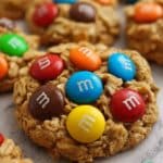 Deliciously chewy Monster Cookies packed with creamy peanut butter, oats, chocolate chips, and colorful M&M’s, perfect for satisfying your sweet tooth with a delightful mix of textures and flavors.