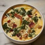 Enjoy a comforting bowl of Olive Garden Zuppa Toscana Soup, a hearty Italian-inspired soup featuring savory Italian sausage, crispy bacon, tender potatoes, and nutrient-rich kale all simmered in a creamy broth. Perfect for a cozy meal with family and friends.