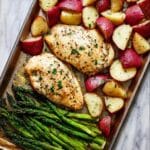 For a dinner party or a more festive meal, try plating each chicken breast atop a bed of the roasted potatoes and asparagus, then drizzle any pan juices over the top for a glossy, restaurant-quality look. You can even serve family-style right from the pan to keep things cozy and casual.