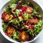 A refreshing and vibrant Pomegranate Greens Salad featuring crunchy roasted walnuts, golden halloumi croutons, and a zesty spiced orange vinaigrette that perfectly balances sweetness and tang.