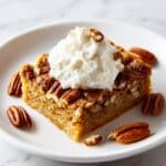This delicious Pumpkin Crunch Cake features a creamy pumpkin custard base topped with a crunchy layer of yellow cake mix, pecans, and butter. Baked to perfection, it is a delightful fall dessert that combines smooth pumpkin flavors with a crisp, buttery topping. Finished with a dollop of Cool Whip and a sprinkle of pumpkin pie spice, this cake is perfect for holidays or cozy gatherings.
