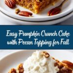 This delicious Pumpkin Crunch Cake features a creamy pumpkin custard base topped with a crunchy layer of yellow cake mix, pecans, and butter. Baked to perfection, it is a delightful fall dessert that combines smooth pumpkin flavors with a crisp, buttery topping. Finished with a dollop of Cool Whip and a sprinkle of pumpkin pie spice, this cake is perfect for holidays or cozy gatherings.